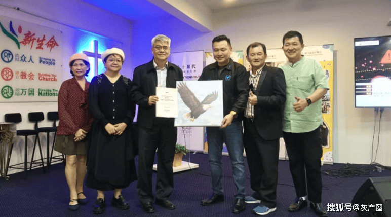 新生命复兴教会主任牧师丘怡安(左三)颁发纪念品予主讲人胡杰良(右三)。共同见证者左起为陈翠萍师母、盘玉卿传道;右起为陈政滨牧师、林韦良传道。(图:亚视新闻)
