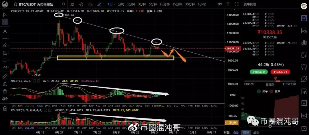 个人意见:还会继续去回踩试探10000点支撑,可能不到三角形末端就会提前破位,短期位置依然看到9500附近。