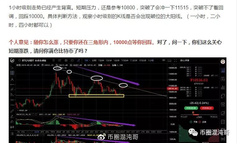 一小时分时级别,已经在10950附近走出了双顶的形态,目前这个位置也是属于三角形形态的压力位,所以行情可能会延续下跌。而小时级别的短期支撑在10000附近,因为短期是有年线作为支撑的。小时级别前期走的也是背离,而目前随着行情下跌,逐渐在修复。短期支撑参考10000,强支撑还是参考9542。