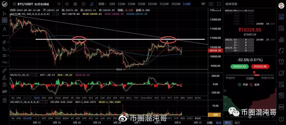 而事实上,行情在9月6日最高到达10907后,触及三角形压力,开始回踩,今日最低到达10070,符合之前所说的回踩。最近几日的走势依然是在三角形内进行整理。而今日的反弹,也是USDT的下跌造成的,u的影响依然很大。