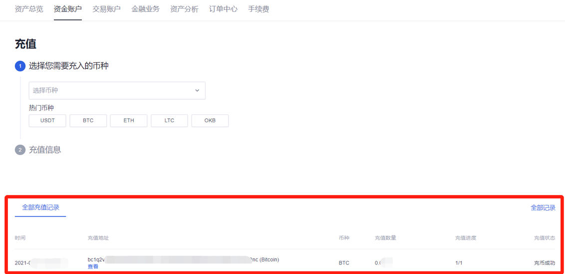 第三步 等待一段时间充币成功后,即可在充币页面查询到充币记录,也可在资产处查看充值至欧易的加密资产。