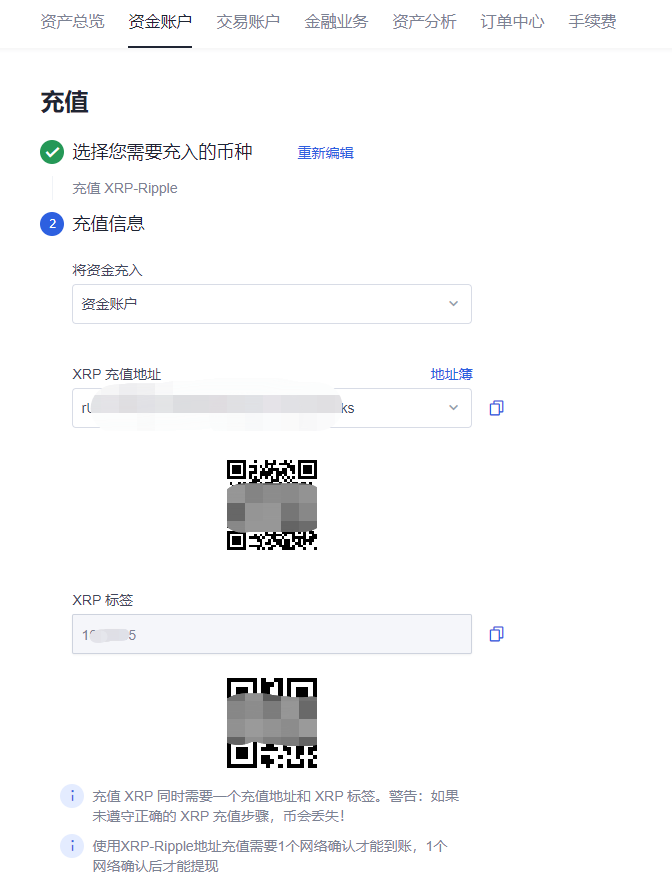 5.部分币种在生成充值地址时会同时生成标签,例如XRP,标签会在充值地址的下方标注,通常是一串数字,充值这些币种时必须需要填写充值地址和标签,否则充值资产不会到账。