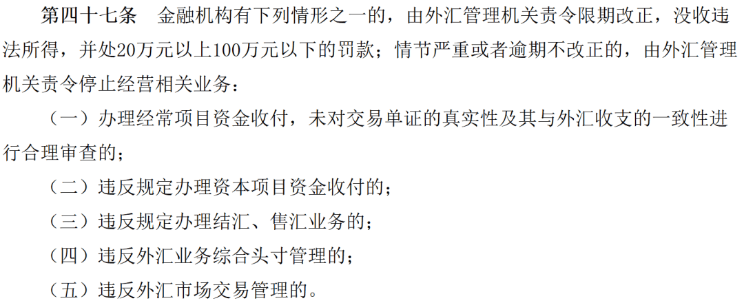 第四十三条:有擅自对外借款、在境外发行债券或者提 供对外担保等违反外债管理行为的,由外汇管理机关给予警 告,处违法金额 30%以下的罚款。