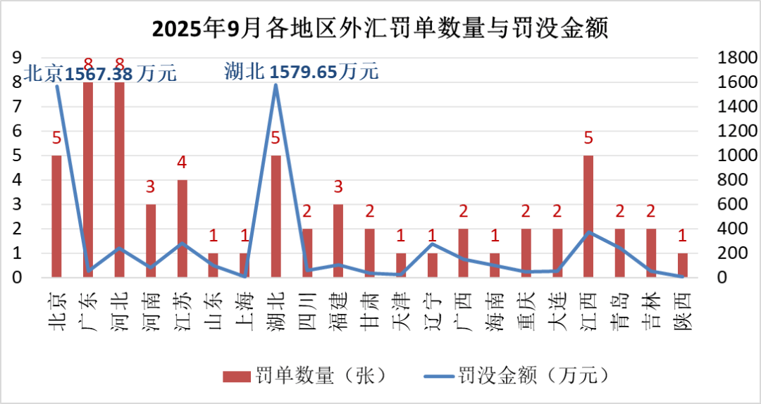 9月外汇违规罚单中,国家外汇管理局广东省、河北省各分局开出的罚单数量最多,各开出8张罚单,湖北、北京开出的罚单金额最大,各自开出5张罚单,罚没金额均超过1500万元。