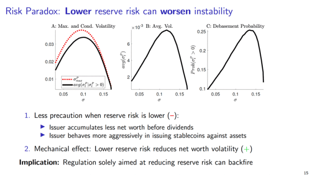 在此框架下,Mayer教授进一步揭示了稳定币的一个风险悖论(risk paradox):在无监管环境中,提高储备资产风险反而有助于提升稳定币的稳定性。这一反直觉结果出现的原因在于,当风险较低时,发行人缺乏预防性缓冲行为,反而可能更易触发脱锚。相反,适度风险可促使发行人通过减少杠杆和储备调整来维持币值稳定。