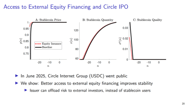 此外,Mayer教授及合作者还分析了稳定币发行人获得股权融资(如Circle公司IPO)的影响,研究发现股权融资能通过风险分担机制,显著提升系统稳定性和发行人估值。