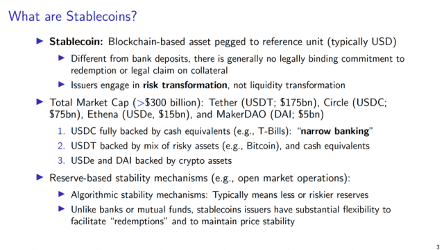 Mayer教授指出,稳定币是一种基于区块链的数字资产,其价值通常与某种参考单位(如美元)挂钩。稳定币发行人资产端为储备资产,而负债端为区块链上锚定法币的代币,具有风险转换特征。目前全球稳定币的总市值已超过三千亿美元,主要发行方包括Tether(USDT,市值约1750亿美元)、Circle(USDC,750亿美元)、Ethereum上的USDe(约150亿美元)以及去中心化的MakerDAO(DAI,约50亿美元)。不同稳定币的资产支撑结构差异显著:USDC完全由现金及等价物(如美国国债)支持,接近于“窄银行(narrow banking)”模式;USDT则由加密资产与现金等价物的组合支撑;而USDe和DAI主要依托于加密资产抵押。