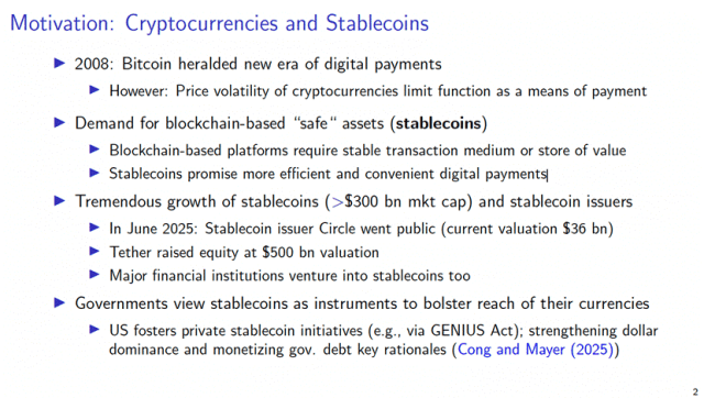Mayer教授首先介绍了本项研究的起源背景。自2008年比特币问世以来,数字支付迎来了新的时代。然而,由于加密货币价格波动剧烈,其作为支付手段的功能受到了限制。这种局限性推动了市场对区块链基础上的“安全资产”稳定币(stablecoins)的需求。区块链平台需要一种稳定的交易媒介或价值储藏手段,而稳定币的出现正好满足了这一需求,承诺实现更高效、更便捷的数字支付方式。